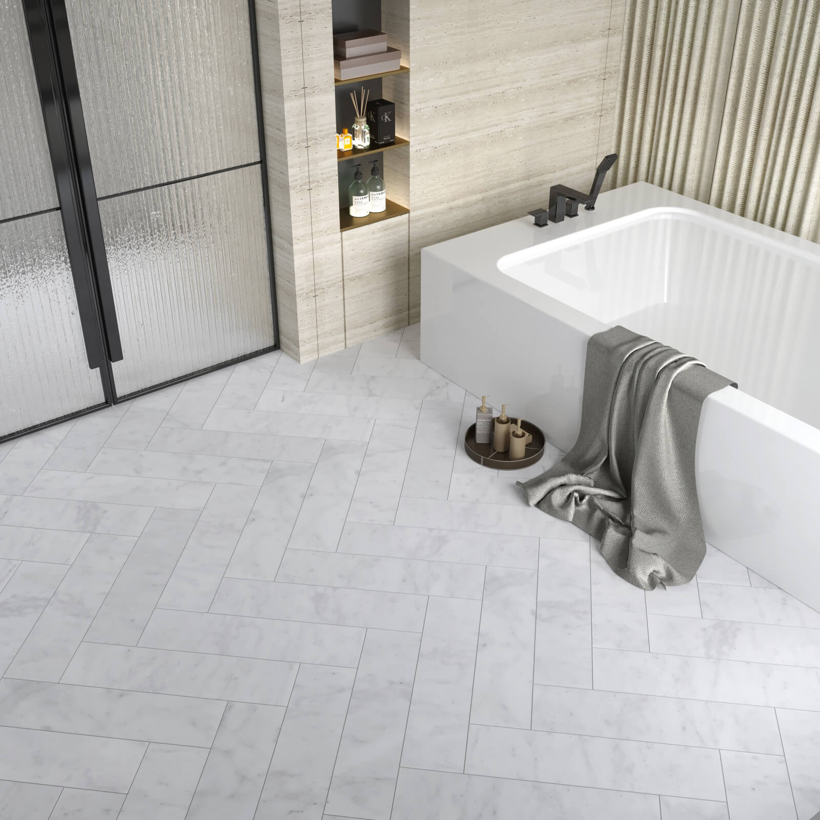 There is no denying that white is a classic and timeless colour in household use, it can be used in many versatile ways in all areas of the house, from the kitchen to the bathroom, within homes of different styles, and now with the availability of many different shapes from hexagons to herringbones, chevrons to oblong hexagons, our Carrara white marble range has more than ever, varying lines of items. Not to mention our multiple lines of man-made porcelain tiles which include our Arabescato, Statuarietto and Cloud white range as well as the natural stone Carrara effect range. Experts continually report that "the white" tile range will never go out of trend. Like it or not, many people love white tiles, including us here at Stone Deals, and there will always be at least one space in your home where you can bet that a white tile will convey a sense of calm and class in the environment.